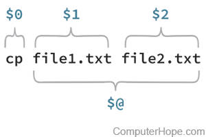 Here we can see that our command is the first positional parameter ($0) and that each of the strings afterwards are additional positional parameters (here $1 and $2). Generally when we refer to positional parameters we ignore $0 and start with $1.