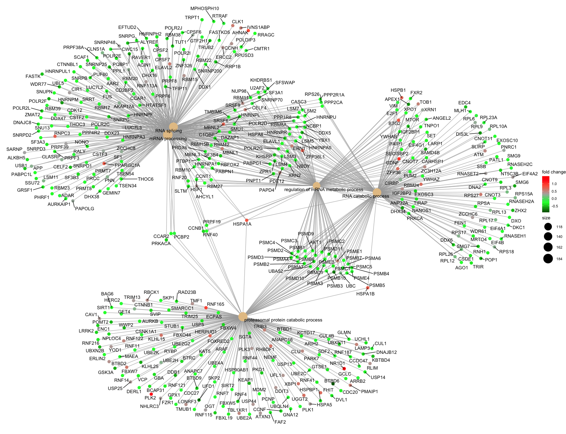 Next, the category netplot shows the relationships between the genes associated with the top five most significant GO terms and the fold changes of the significant genes associated with these terms (color). The size of the GO terms reflects the pvalues of the terms, with the more significant terms being larger. This plot is particularly useful for hypothesis generation in identifying genes that may be important to several of the most affected processes.