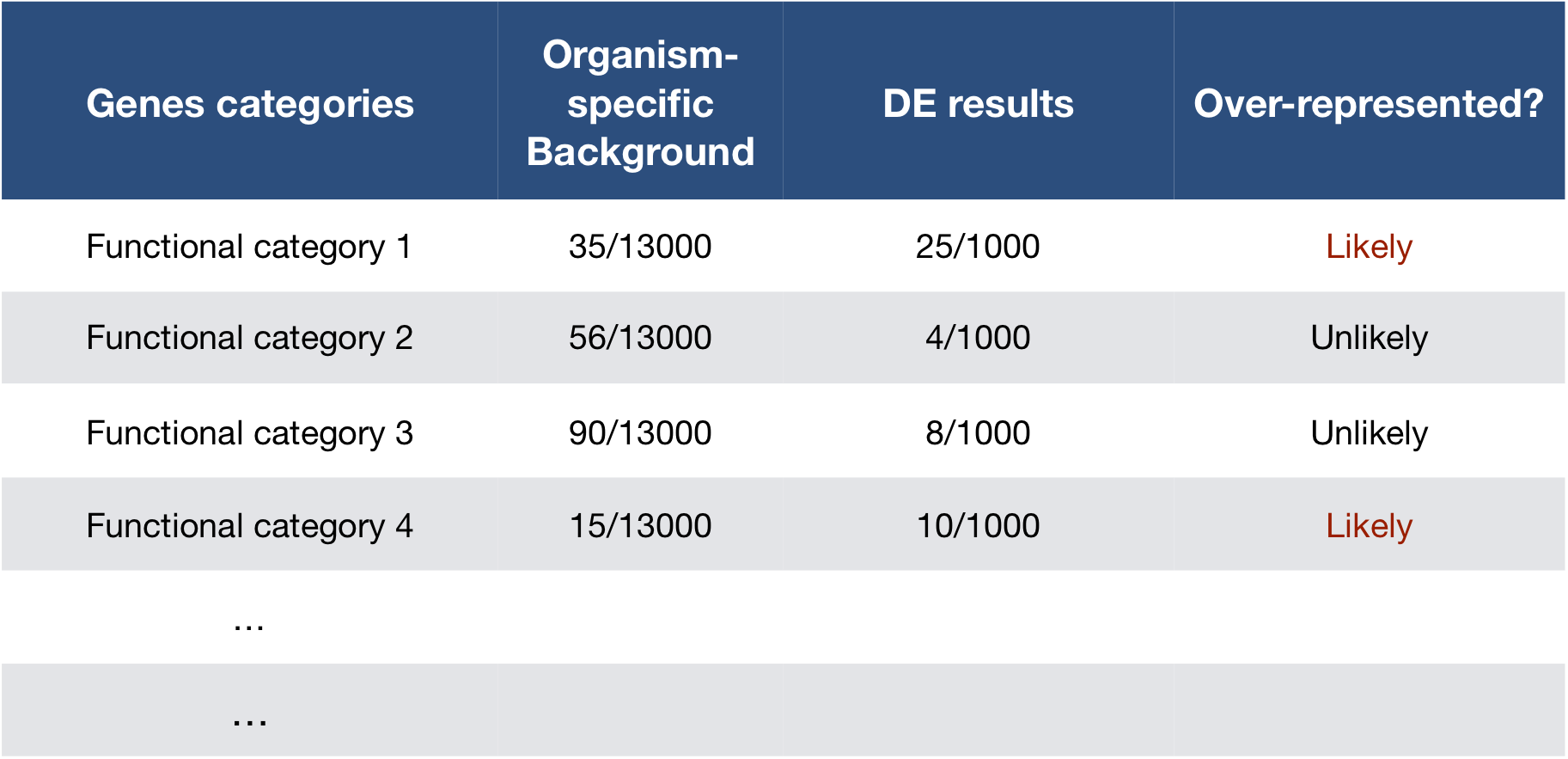 Using the example of the first functional category above, hypergeometric distribution is a probability distribution that describes the probability of 25 genes (k) being associated with “Functional category 1”, for all genes in our gene list (n=1000), from a population of all of the genes in entire genome (N=13,000) which contains 35 genes (K) associated with “Functional category 1” [4].