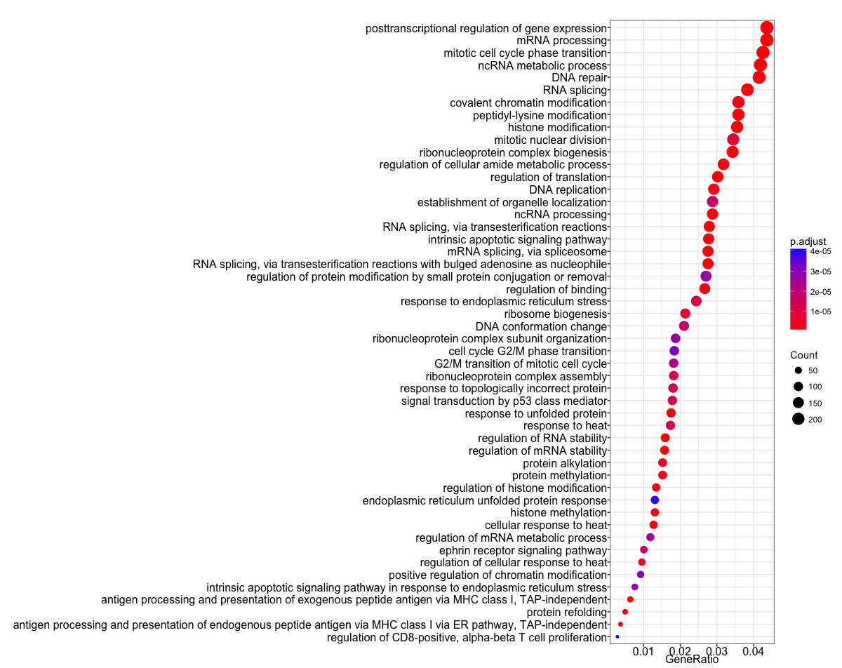 The goal of functional analysis is provide biological insight, so it’s necessary to analyze our results in the context of our experimental hypothesis: FMRP and MOV10 associate and regulate the translation of a subset of RNAs. Therefore, based on the authors’ hypothesis, we may expect the enrichment of processes/pathways related to translation, splicing, and the regulation of mRNAs, which we would need to validate experimentally.